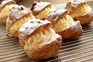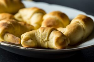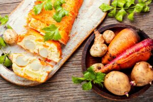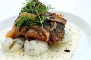 Śledzie z mleczkiem wymoczyć, ściągnąć skórki, mleczko odłożyć na sos, wypatroszyć, zawinąć śledzie w czysty papier wysmarowany masłem, wsunąć na blasze do piekarnika, piec wolno kwadrans, polewając często po wierzchu masłem. Upieczone śledzie ostudzić, pociąć na ukośne cząstki, ułożyć w małej salaterce, zalać marynatą. Prze- trzeć mleczko przez sito, rozetrzeć z oli- wą, dodać sok […]