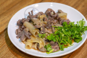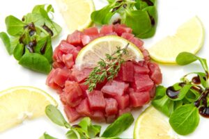 Tuńczyka myjemy, osuszamy i usuwamy skórę oraz ości. Mięso siekamy. Cytrynę po sparzeniu wrzątkiem obieramy bardzo cienko lub ścieramy na drobnej tarce, jeśli obieramy to drobniutko siekamy. Mieszamy wszystkie przyprawy z rybą. Podajemy na grzankach z tostowego chleba, posypując tatara z tuńczyka grubą solą i skrapiając oliwą. Autorem przepisu jest Jakub Kuroń. Przepis pochodzi […]