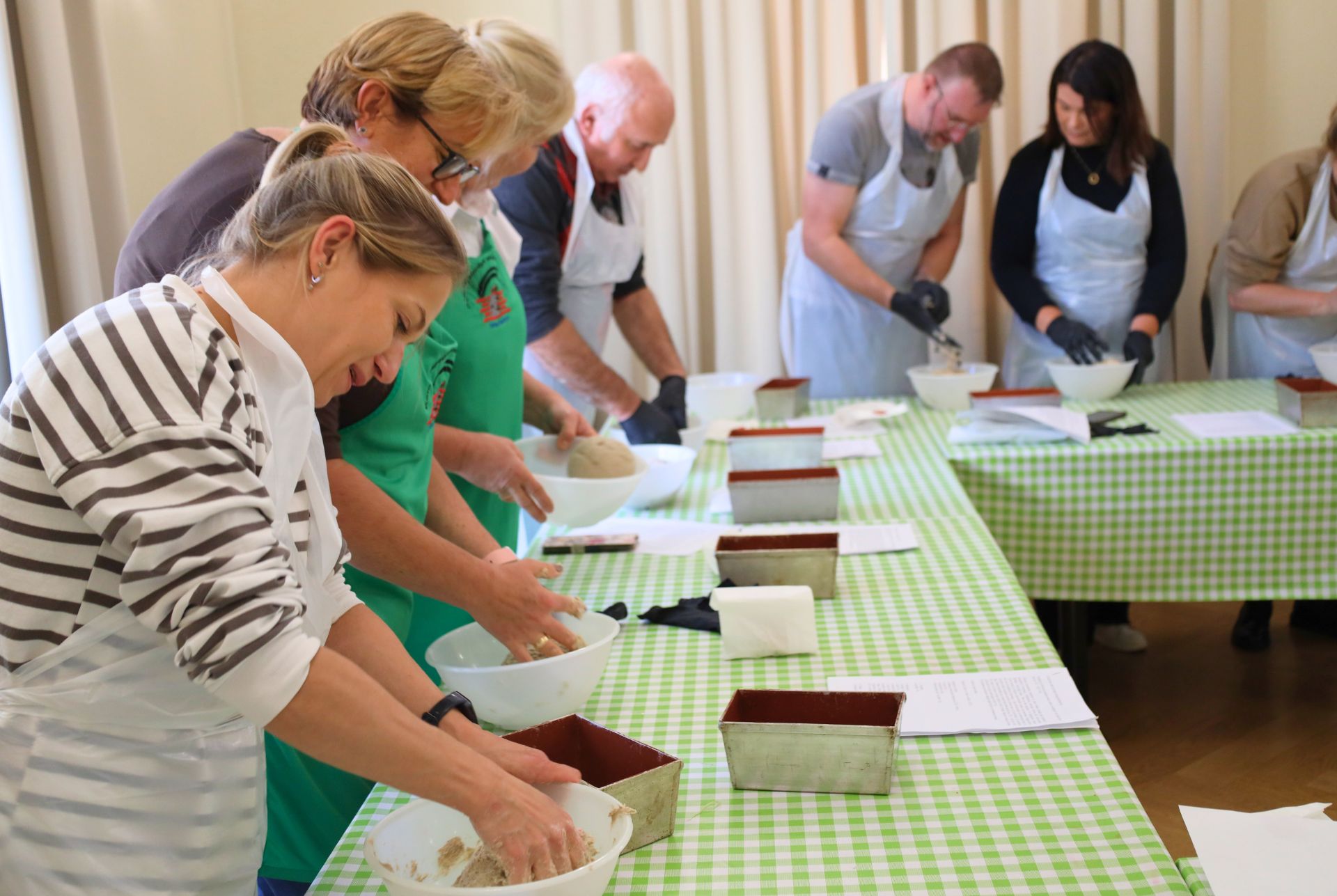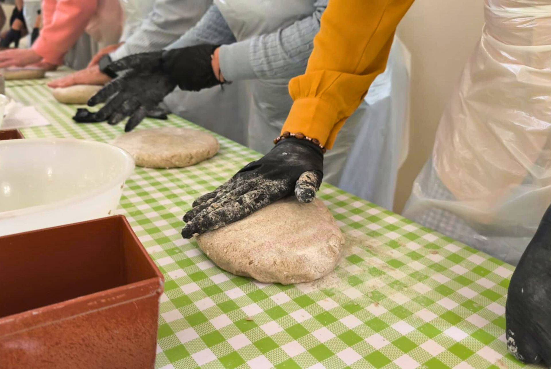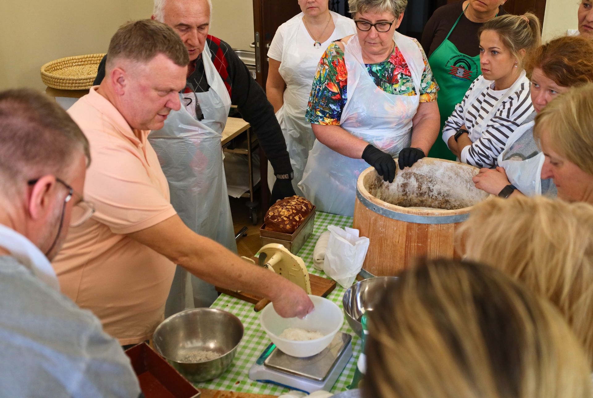 Podczas zajęć 5.11.2025 uczestnicy dowiedzieli się, jak powstaje kwas do wypieku chleba, jakie właściwości kryją różne rodzaje mąki oraz jaką rolę w procesie odgrywają drożdże i sól. Praktycznym efektem tych nauk był własnoręcznie przygotowany chleb żytni pytlowy, zwany też sitkowym – wypiek, który wymaga cierpliwości, precyzji i serca.